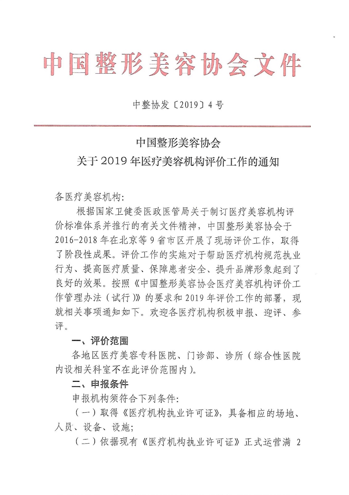 中整协发【2019】4号《关于2019年医疗美容机构评价工作的通知》