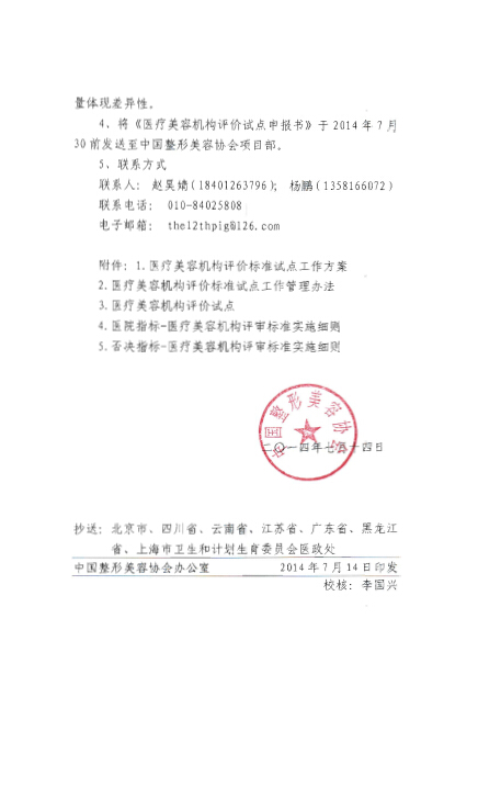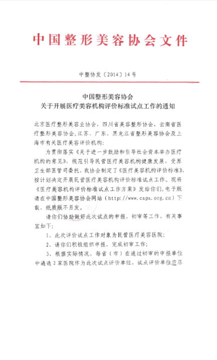 【中整协发(2014)14号】中国整形美容协会关于开展医疗美容机构评价标准评价试点工作的通知